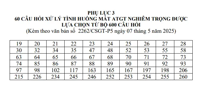 – Sát hạch cấp Giấy phép lái xe hạng A1, A gồm 250 câu được chọn lọc từ bộ 600 câu hỏi, trong đó có 20 câu về xử lý tình huống mất an toàn giao thông nghiêm trọng (Phụ lục I Công văn 2262/CSGT-P5 2025).